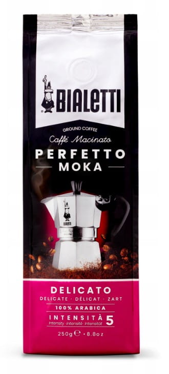 Bialetti Perfetto Moka Delicato podkreśla harmonijne niuanse orzecha laskowego i suszonych owoców dzięki lekkiemu paleniu dla miłośników łagodnej, delikatnej kawy. Dzięki doborowi najlepszych surowców, doskonałemu wymieszaniu i starannemu wypaleniu, kawa mielona Bialetti gwarantuje idealne połączenie smaków i aromatów, którymi można się delektować z dzbankiem Moka Express.