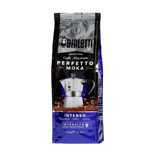 Bialetti Perfetto Moka Intenso to idealna kawa do Twojego dzbanka Moka. Łączy długi, kontrolowany okres palenia, który pomaga wydobyć całe spektrum aromatyczne tej intensywnej kawy, ze specjalnie zaprojektowanym mieleniem, aby zapewnić mocniejszy, bardziej intensywny i skoncentrowany efekt.