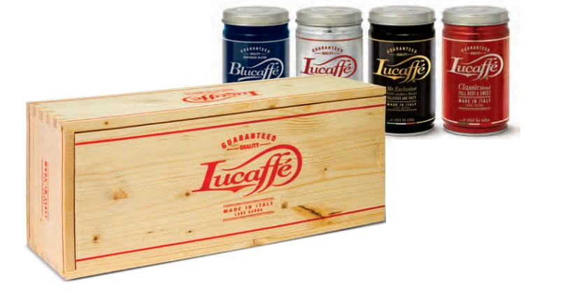 - pudełko pomieści 4 puszki kawy Lucaffé 250g